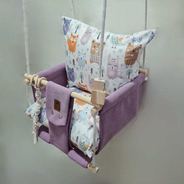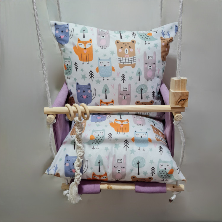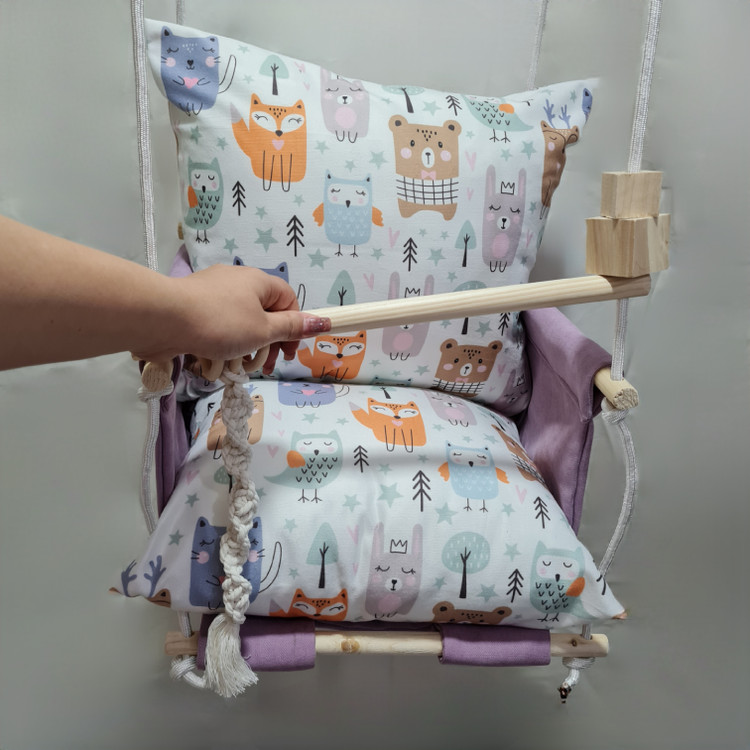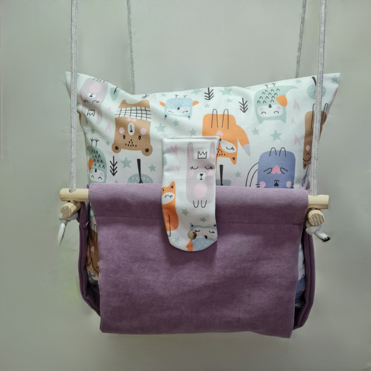 تاب کودک ام دی سری مبله کامل مدل ارغوان، وسیله ای سرگرم کننده و جذاب برای کودکان در محیط خانه و فضای باز است. یکی از بهترین بازی ها برای بچه ها، تاب بازی در منزل است که باعث احساس آرامش و لذت کودکان میشود. (از این تاب میتوانید در فضای باز و طبیعت هم استفاده کنید.) این تاب قابل نصب به میله بارفیکس و یا بست های سقفی می باشد. پارچه ی استفاده شده در این محصول از نوع پارچههای با کیفیت مبلی ترک (تمام نخ – ضد آلرژی) برای بدنه اصلی و پارچه مخمل پورشه برای تشکچه ها می باشد؛ همچنین از چوب طبیعی روسی باکیفیت بدون لبه های تیز استفاده شده است. فضای نشیمن کودک داخل تاب حدود 40 سانت در 40 سانت است وزن قابل تحمل تاب ام دی 35 کیلوگرم می باشد و مناسب همه کودکانی که توانایی نشستن را دارند می باشد. هچنین سهولت در نشستن کودک قسمت کوسن پشتی به وسیله دکمه ای به بدنه اصلی متصل شده است و هر دو تشکچه به جهت شستشوی راحت تر دارای زیپ هستند. در بستهی این محصول به جهت سرگرم شدن کودک آویز هایی از مغز تنه درختان و آویز مکرومه ای قرار داده شده است. این تاب به صورت مونتاژ شده و در کاور مخصوص برای مشتریان عزیز ارسال می گردد.