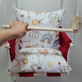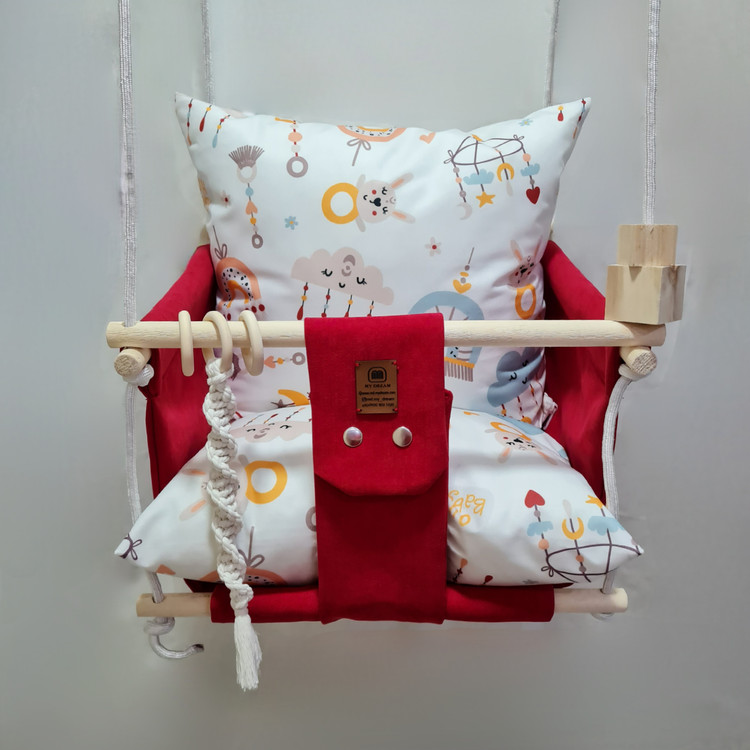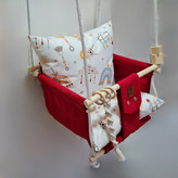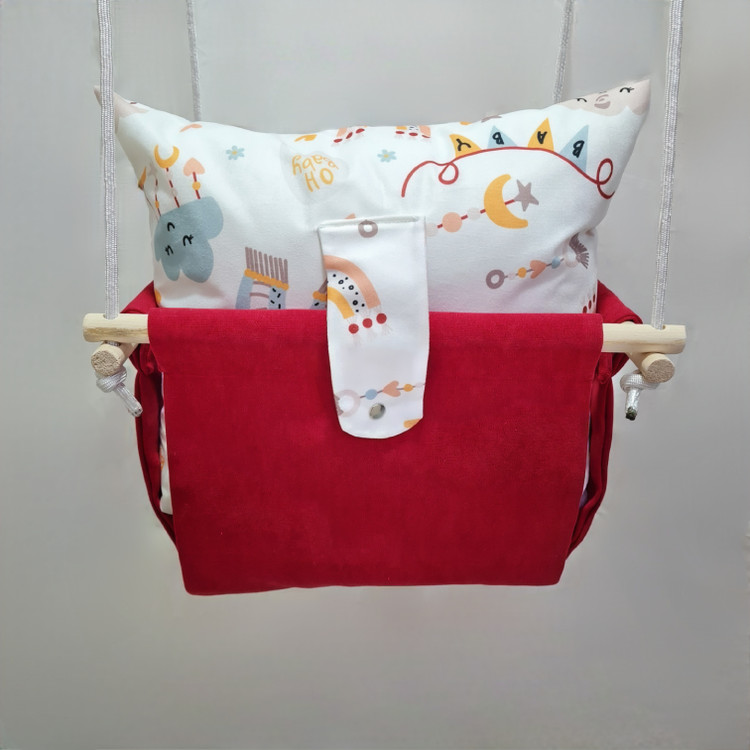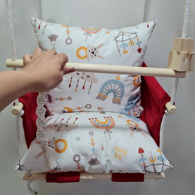 تاب کودک ام دی سری مبله کامل مدل شکوفا، وسیله ای سرگرم کننده و جذاب برای کودکان در محیط خانه و فضای باز است. یکی از بهترین بازی ها برای بچه ها، تاب بازی در منزل است که باعث احساس آرامش و لذت کودکان میشود. (از این تاب میتوانید در فضای باز و طبیعت هم استفاده کنید.) این تاب قابل نصب به میله بارفیکس و یا بست های سقفی می باشد. پارچه ی استفاده شده در این محصول از نوع پارچههای با کیفیت مبلی ترک (تمام نخ – ضد آلرژی) برای بدنه اصلی و پارچه مخمل پورشه برای تشکچه ها می باشد؛ همچنین از چوب طبیعی روسی باکیفیت بدون لبه های تیز استفاده شده است. فضای نشیمن کودک داخل تاب حدود 40 سانت در 40 سانت است وزن قابل تحمل تاب ام دی 35 کیلوگرم می باشد و مناسب همه کودکانی که توانایی نشستن را دارند می باشد. هچنین سهولت در نشستن کودک قسمت کوسن پشتی به وسیله دکمه ای به بدنه اصلی متصل شده است و هر دو تشکچه به جهت شستشوی راحت تر دارای زیپ هستند. در بستهی این محصول به جهت سرگرم شدن کودک آویز هایی از مغز تنه درختان و آویز مکرومه ای قرار داده شده است. این تاب به صورت مونتاژ شده و در کاور مخصوص برای مشتریان عزیز ارسال می گردد.