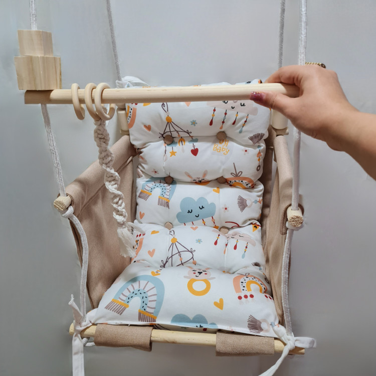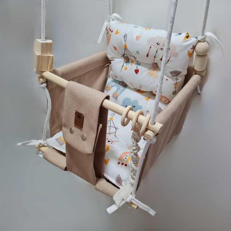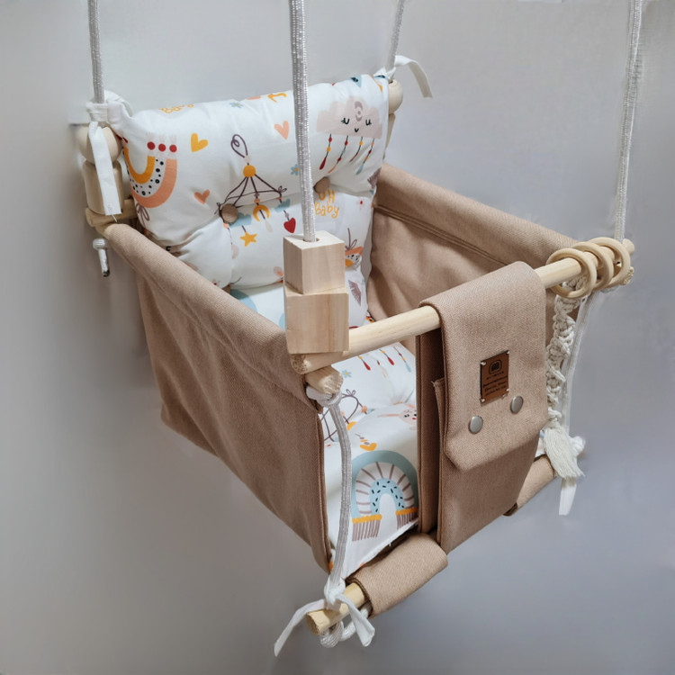 تاب کودک ام دی سری مبله کامل مدل ملودی، وسیله ای سرگرم کننده و جذاب برای کودکان در محیط خانه و فضای باز است. یکی از بهترین بازی ها برای بچه ها، تاب بازی در منزل است که باعث احساس آرامش و لذت کودکان میشود. (از این تاب میتوانید در فضای باز و طبیعت هم استفاده کنید.) این تاب قابل نصب به میله بارفیکس و یا بست های سقفی می باشد. پارچه ی استفاده شده در این محصول از نوع پارچههای با کیفیت مبلی ترک (تمام نخ – ضد آلرژی) برای بدنه اصلی و پارچه مخمل پورشه برای تشکچه ها می باشد؛ همچنین از چوب طبیعی روسی باکیفیت بدون لبه های تیز استفاده شده است. فضای نشیمن کودک داخل تاب حدود 40 سانت در 40 سانت است وزن قابل تحمل تاب ام دی 35 کیلوگرم می باشد و مناسب همه کودکانی که توانایی نشستن را دارند می باشد. هچنین سهولت در نشستن کودک قسمت کوسن پشتی به وسیله بندک هایی به بدنه اصلی متصل شده است، در این مدل جهت راحتی بیشتر تشکچه بصورت یکپارچه طراحی شده است و همچنین دکمه دوزی تشکچه باعث جلوه زیباتری در این تاب شده است. در بستهی این محصول به جهت سرگرم شدن کودک آویز هایی از مغز تنه درختان و آویز مکرومه ای قرار داده شده است. این تاب به صورت مونتاژ شده و در کاور مخصوص برای مشتریان عزیز ارسال می گردد.