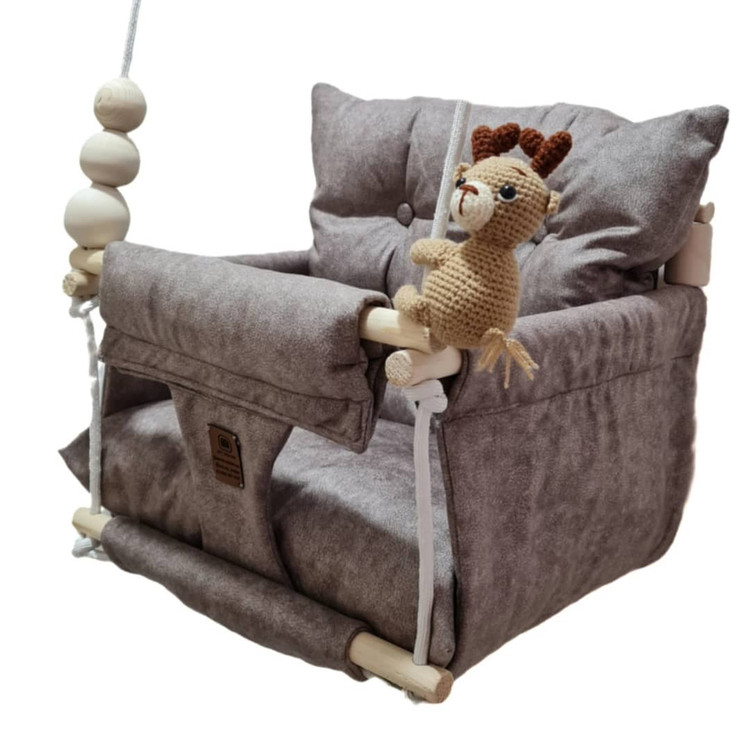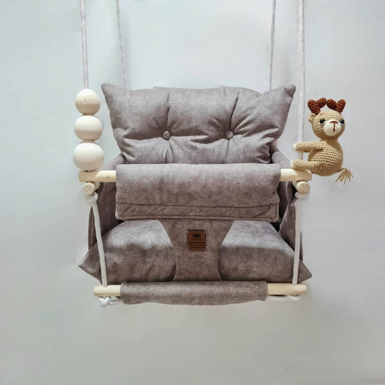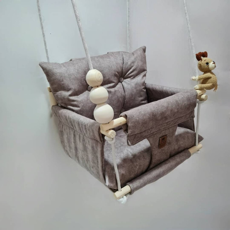 تاب کودک ام دی سری مبله لاکچری مدل دلوان، وسیله ای سرگرم کننده و جذاب برای کودکان در محیط خانه و فضای باز است. یکی از بهترین بازی ها برای بچه ها، تاب بازی در منزل است که باعث احساس آرامش و لذت کودکان میشود. (از این تاب میتوانید در فضای باز و طبیعت هم استفاده کنید.) این تاب قابل نصب به میله بارفیکس و یا بست های سقفی می باشد. پارچه ی استفاده شده در این محصول از نوع پارچههای با کیفیت مبلی ترک (تمام نخ – ضد آلرژی) می باشد، همچنین از چوب طبیعی روسی باکیفیت بدون لبه های تیز استفاده شده است. فضای نشیمن کودک داخل تاب حدود 40 سانت در 40 سانت است وزن قابل تحمل تاب ام دی ۴۰ کیلوگرم می باشد و مناسب همه کودکانی که توانایی نشستن را دارند می باشد. هچنین سهولت در نشستن کودک قسمت کوسن پشتی به وسیله دو دکمه به بدنه اصلی متصل شده است. در بستهی این محصول به جهت سرگرم شدن کودک آویز هایی از مغز تنه درختان و عروسک زیبایی که کار دست می باشد تعبیه شده است. این تاب به صورت مونتاژ شده و در کاور مخصوص برای مشتریان عزیز ارسال می گردد.