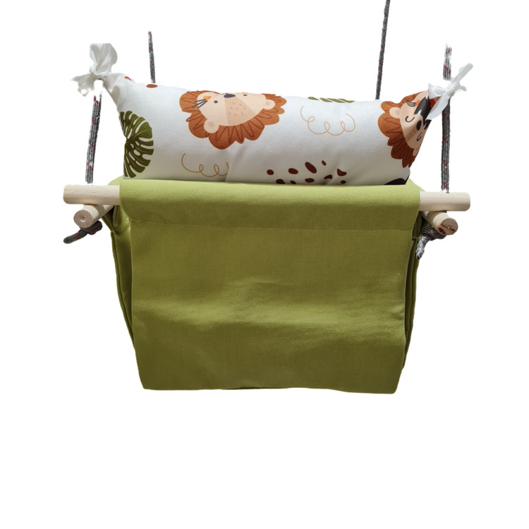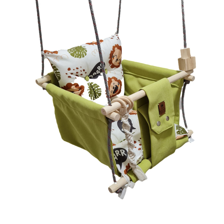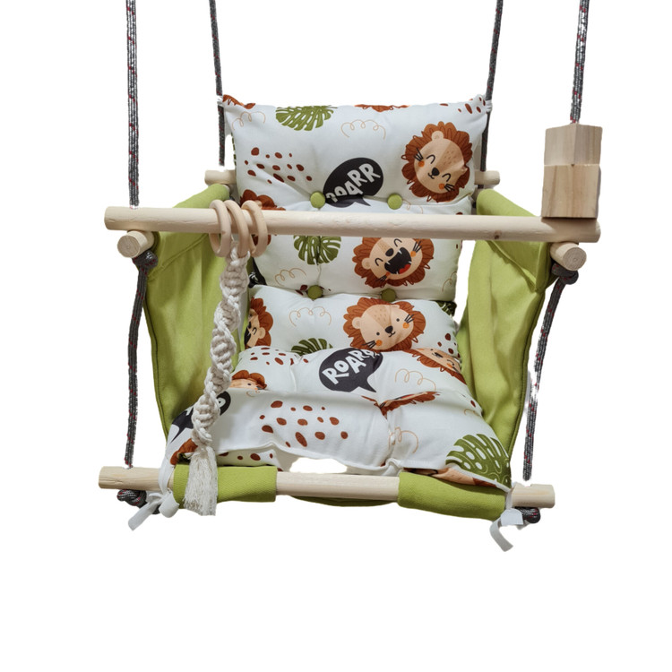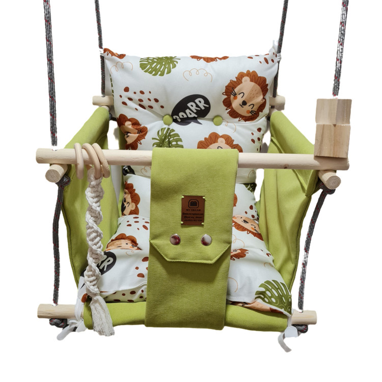 تاب کودک ام دی سری مبله کامل مدل نگارین(کوسن یکپارچه) ، وسیله ای سرگرم کننده و جذاب برای کودکان در محیط خانه و فضای باز است. یکی از بهترین بازی ها برای بچه ها، تاب بازی در منزل است که باعث احساس آرامش و لذت کودکان میشود. (از این تاب میتوانید در فضای باز و طبیعت هم استفاده کنید.) این تاب قابل نصب به میله بارفیکس و یا بست های سقفی می باشد. پارچه ی استفاده شده در این محصول از نوع پارچههای با کیفیت مبلی ترک (تمام نخ – ضد آلرژی) برای بدنه اصلی و پارچه مخمل پورشه برای تشکچه ها می باشد؛ همچنین از چوب طبیعی روسی باکیفیت بدون لبه های تیز استفاده شده است. فضای نشیمن کودک داخل تاب حدود 40 سانت در 40 سانت است وزن قابل تحمل تاب ام دی 35 کیلوگرم می باشد و مناسب همه کودکانی که توانایی نشستن را دارند می باشد. هچنین سهولت در نشستن کودک قسمت کوسن پشتی به وسیله بندک هایی به بدنه اصلی متصل شده است، در این مدل جهت راحتی بیشتر تشکچه بصورت یکپارچه طراحی شده است و همچنین دکمه دوزی تشکچه باعث جلوه زیباتری در این تاب شده است. در بستهی این محصول به جهت سرگرم شدن کودک آویز هایی از مغز تنه درختان و آویز مکرومه ای قرار داده شده است. این تاب به صورت مونتاژ شده و در کاور مخصوص برای مشتریان عزیز ارسال می گردد.