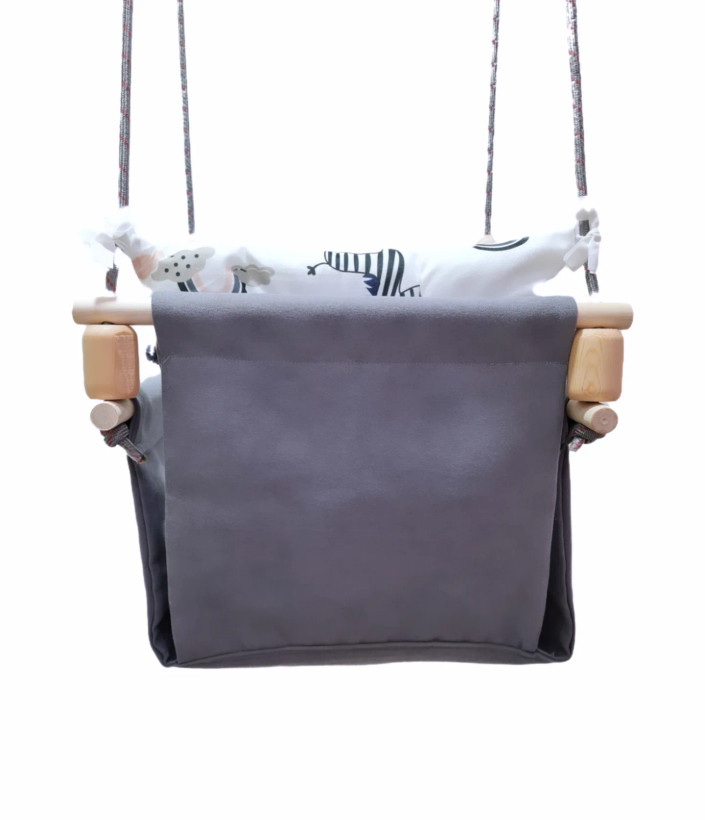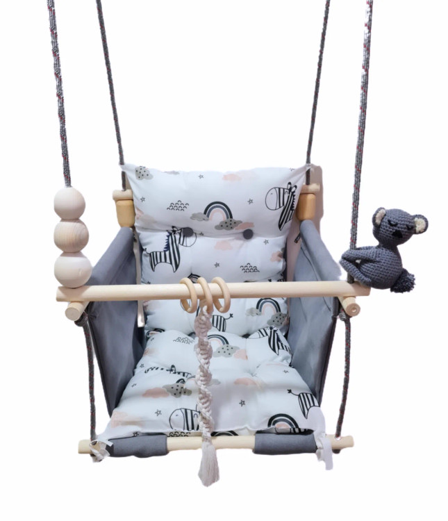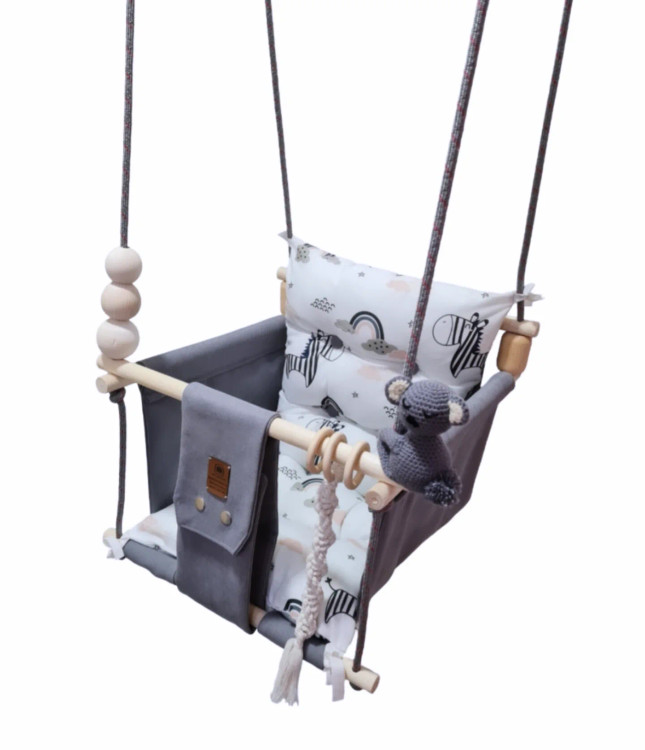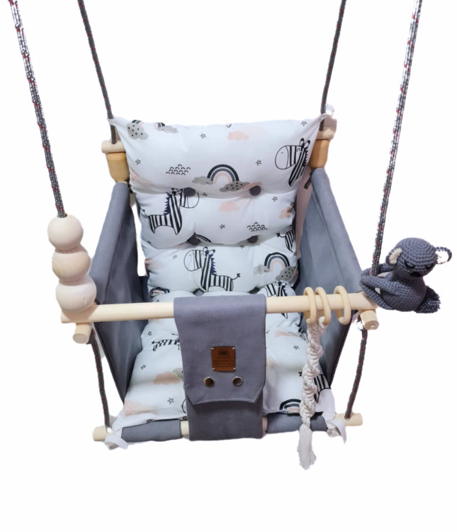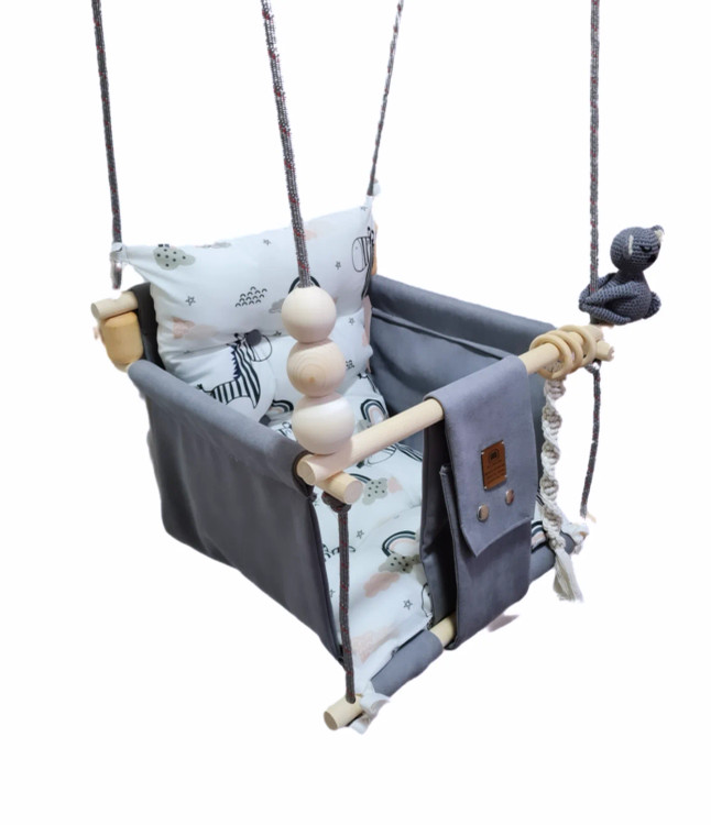 تاب کودک ام دی سری مبله کامل مدل لیلیان(کوسن یکپارچه) ، وسیله ای سرگرم کننده و جذاب برای کودکان در محیط خانه و فضای باز است. یکی از بهترین بازی ها برای بچه ها، تاب بازی در منزل است که باعث احساس آرامش و لذت کودکان میشود. (از این تاب میتوانید در فضای باز و طبیعت هم استفاده کنید.) این تاب قابل نصب به میله بارفیکس و یا بست های سقفی می باشد. پارچه ی استفاده شده در این محصول از نوع پارچههای با کیفیت مبلی ترک (تمام نخ – ضد آلرژی) برای بدنه اصلی و پارچه مخمل پورشه برای تشکچه ها می باشد؛ همچنین از چوب طبیعی روسی باکیفیت بدون لبه های تیز استفاده شده است. فضای نشیمن کودک داخل تاب حدود 40 سانت در 40 سانت است وزن قابل تحمل تاب ام دی 45 کیلوگرم می باشد و مناسب همه کودکانی که توانایی نشستن را دارند می باشد. هچنین سهولت در نشستن کودک قسمت کوسن پشتی به وسیله بندک هایی به بدنه اصلی متصل شده است، در این مدل جهت راحتی بیشتر تشکچه بصورت یکپارچه طراحی شده است و همچنین دکمه دوزی تشکچه باعث جلوه زیباتری در این تاب شده است. در بستهی این محصول به جهت سرگرم شدن کودک آویز هایی از مغز تنه درختان و آویز مکرومه ای قرار داده شده است. این تاب به صورت مونتاژ شده و در کاور مخصوص برای مشتریان عزیز ارسال می گردد.
