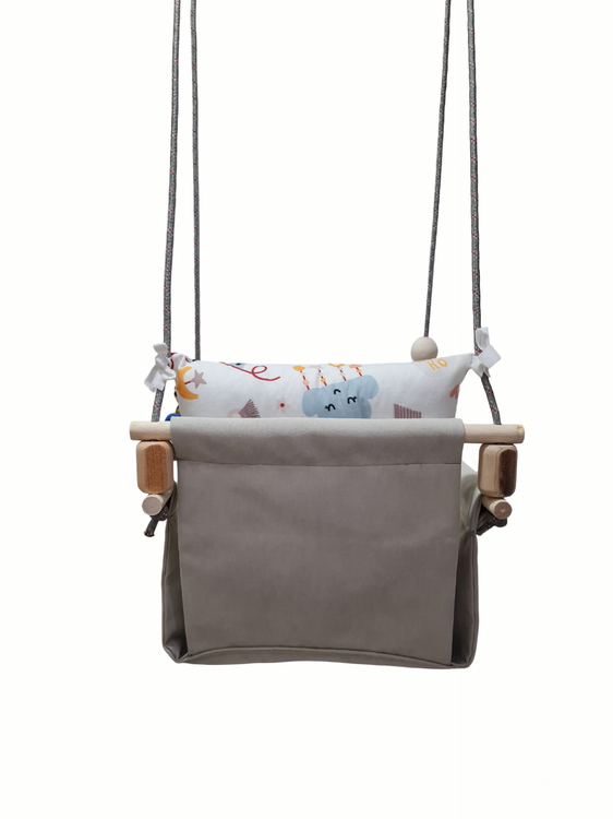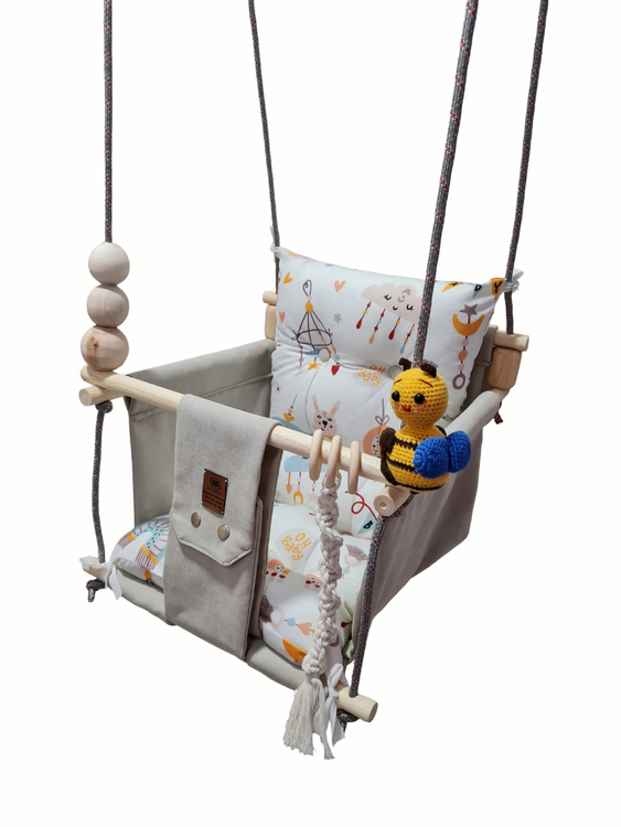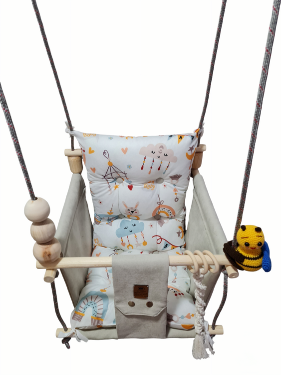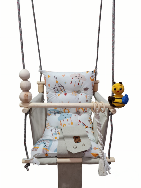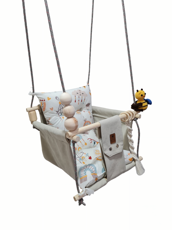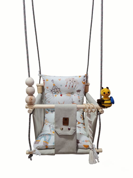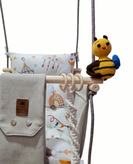 تاب کودک ام دی سری مبله کامل مدل ملورین(کوسن یکپارچه) ، وسیله ای سرگرم کننده و جذاب برای کودکان در محیط خانه و فضای باز است. یکی از بهترین بازی ها برای بچه ها، تاب بازی در منزل است که باعث احساس آرامش و لذت کودکان میشود. (از این تاب میتوانید در فضای باز و طبیعت هم استفاده کنید.) این تاب قابل نصب به میله بارفیکس و یا بست های سقفی می باشد. پارچه ی استفاده شده در این محصول از نوع پارچههای با کیفیت مبلی ترک (تمام نخ – ضد آلرژی) برای بدنه اصلی و پارچه مخمل پورشه برای تشکچه ها می باشد؛ همچنین از چوب طبیعی روسی باکیفیت بدون لبه های تیز استفاده شده است. فضای نشیمن کودک داخل تاب حدود 40 سانت در 40 سانت است وزن قابل تحمل تاب ام دی 45 کیلوگرم می باشد و مناسب همه کودکانی که توانایی نشستن را دارند می باشد. هچنین سهولت در نشستن کودک قسمت کوسن پشتی به وسیله بندک هایی به بدنه اصلی متصل شده است، در این مدل جهت راحتی بیشتر تشکچه بصورت یکپارچه طراحی شده است و همچنین دکمه دوزی تشکچه باعث جلوه زیباتری در این تاب شده است. در بستهی این محصول به جهت سرگرم شدن کودک آویز هایی از مغز تنه درختان و آویز مکرومه ای قرار داده شده است. این تاب به صورت مونتاژ شده و در کاور مخصوص برای مشتریان عزیز ارسال می گردد.