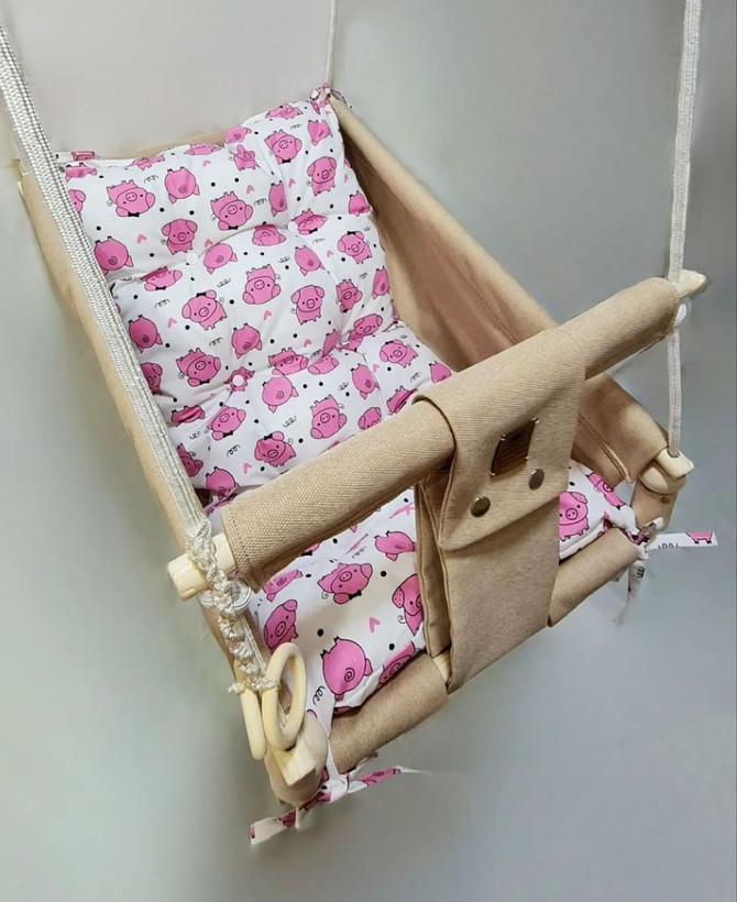 تاب کودک ام دی سری ننوئی مدل نوا، وسیله ای سرگرم کننده و جذاب برای کودکان در محیط خانه و فضای باز است. یکی از بهترین بازی ها برای بچه ها، تاب بازی در منزل است که باعث احساس آرامش و لذت کودکان میشود. (از این تاب میتوانید در فضای باز و طبیعت هم استفاده کنید.) این تاب قابل نصب به میله بارفیکس و یا بست های سقفی می باشد. پارچه ی استفاده شده در این محصول از نوع پارچههای با کیفیت مبلی ترک (تمام نخ – ضد آلرژی) برای بدنه اصلی و پارچه کتان نخ لایکو برای تشکچه ها می باشد؛ همچنین از چوب طبیعی روسی باکیفیت بدون لبه های تیز استفاده شده است. فضای نشیمن کودک داخل تاب حدود 40 سانت در 60 سانت است وزن قابل تحمل تاب ام دی 45 کیلوگرم می باشد و مناسب همه کودکان از بدو تولد می باشد که با تنظیم طناب های پشتی به سه حالت خوابیده، لمیده و نشسته در می آید. همچنین قسمت تشکچه با چهار عدد بند در چهار جهت به بنده اصلی متصل می گردد. در بستهی این محصول به جهت سرگرم شدن کودک آویز مکرومه ای قرار داده شده است. این تاب به صورت مونتاژ شده و در کاور مخصوص برای مشتریان عزیز ارسال می گردد.