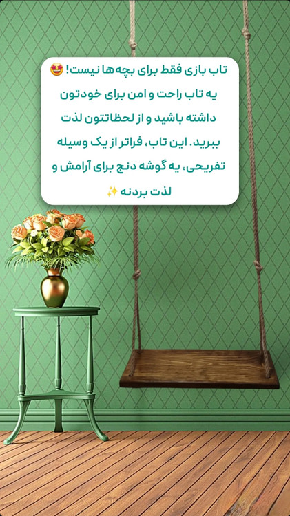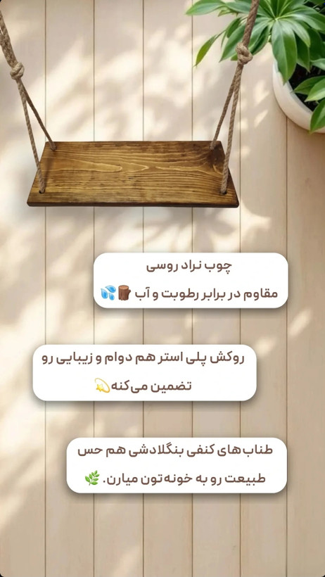 تاب بازی فقط برای بچه ها نیست! تاب ام دی سری تاب چوبی مدل آریا، وسیله ای سرگرم کننده و جذاب برای کودکان، نوجوانان و بزرگسالان در محیط خانه و فضای باز است. یکی از بهترین بازی ها در دورهمی های خانوادگی برای همه رده های سنی تاب بازی می باشد. (از این تاب میتوانید در فضای باز و طبیعت هم استفاده کنید.) این تاب قابل نصب به شاخه درختان، میله ها و لوله های فلزی، میله بارفیکس و یا بست های سقفی می باشد. چوب استفاده شده در این مدل از تاب ها چوب صد در صد طبیعی نراد روسی می باشد که بسیار مقاوم در برابر آب و رطوبت می باشد همچنین برای جلوه و زیبایی و دوام بیشتر از روکش براق پلی استر در این تاب ها استفاده شده است. لبه های تاب چوبی گرد شده اند تا در موقع تاب بازی هیچ فشاری را به بدن شما وارد ننماید. ابعاد این تاب ۴۰*۶۰ و قطر آن ۳ سانتی متر است، وزن قابل تحمل تاب ام دی ۱۲۰ کیلوگرم می باشد و مناسب همه از سنین کودکی تا بزرگسالی می باشد. برای استهکام بیشتر از طناب کنفی بنگلادشی و قلاب کوهنوردی کارابین در این مدل تاب ها استفاه شده است. این تاب ها را می توانید در دو رنگ کرم(رنگ چوب) و قهوه ای تهییه نمایید. این تاب به صورت مونتاژ شده و در کاور مخصوص برای مشتریان عزیز ارسال می گردد.