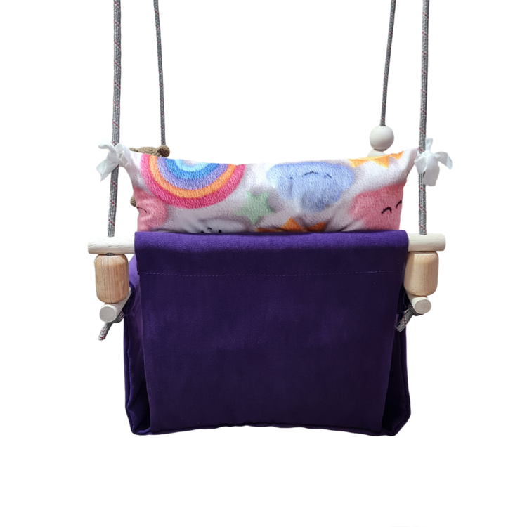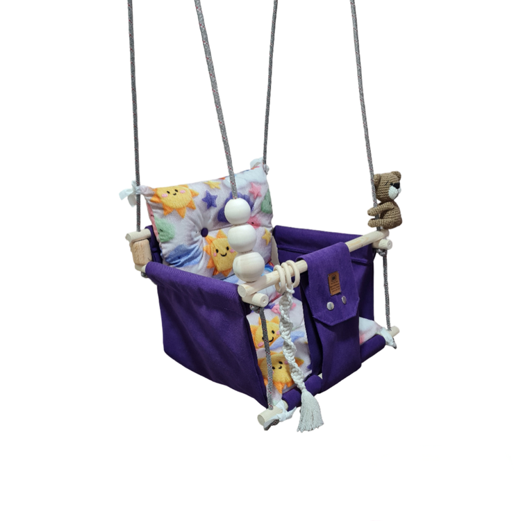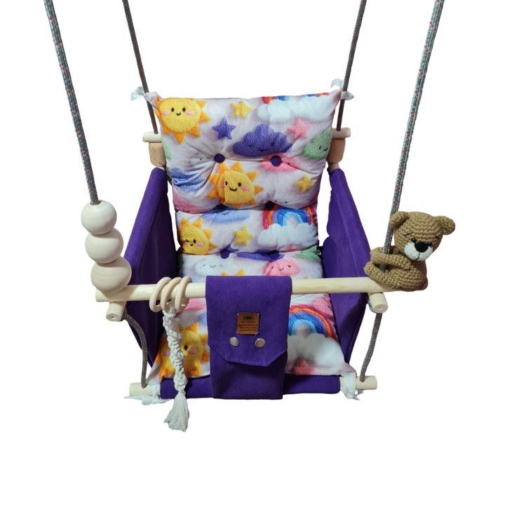 تاب کودک ام دی سری مبله کامل مدل آسمان(کوسن یکپارچه) ، وسیله ای سرگرم کننده و جذاب برای کودکان در محیط خانه و فضای باز است. یکی از بهترین بازی ها برای بچه ها، تاب بازی در منزل است که باعث احساس آرامش و لذت کودکان میشود. (از این تاب میتوانید در فضای باز و طبیعت هم استفاده کنید.) این تاب قابل نصب به میله بارفیکس و یا بست های سقفی می باشد. پارچه ی استفاده شده در این محصول از نوع پارچههای با کیفیت مبلی ترک (تمام نخ – ضد آلرژی) برای بدنه اصلی و پارچه مخمل پورشه برای تشکچه ها می باشد؛ همچنین از چوب طبیعی روسی باکیفیت بدون لبه های تیز استفاده شده است. فضای نشیمن کودک داخل تاب حدود 40 سانت در 40 سانت است وزن قابل تحمل تاب ام دی 45 کیلوگرم می باشد و مناسب همه کودکانی که توانایی نشستن را دارند می باشد. هچنین سهولت در نشستن کودک قسمت کوسن پشتی به وسیله بندک هایی به بدنه اصلی متصل شده است، در این مدل جهت راحتی بیشتر تشکچه بصورت یکپارچه طراحی شده است و همچنین دکمه دوزی تشکچه باعث جلوه زیباتری در این تاب شده است. در بستهی این محصول به جهت سرگرم شدن کودک آویز هایی از مغز تنه درختان و آویز مکرومه ای قرار داده شده است. این تاب به صورت مونتاژ شده و در کاور مخصوص برای مشتریان عزیز ارسال می گردد.