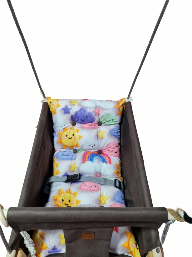تاب کودک ام دی سری ننوئی مدل ابرا، وسیله ای سرگرم کننده و جذاب برای کودکان در محیط خانه و فضای باز است. یکی از بهترین بازی ها برای بچه ها، تاب بازی در منزل است که باعث احساس آرامش و لذت کودکان میشود. (از این تاب میتوانید در فضای باز و طبیعت هم استفاده کنید.) این تاب قابل نصب به میله بارفیکس و یا بست های سقفی می باشد. پارچه ی استفاده شده در این محصول از نوع پارچههای با کیفیت مبلی ترک (تمام نخ – ضد آلرژی) برای بدنه اصلی و پارچه مخمل پورشه برای تشکچه ها می باشد؛ همچنین از چوب طبیعی روسی باکیفیت بدون لبه های تیز استفاده شده است. فضای نشیمن کودک داخل تاب حدود 40 سانت در 60 سانت است وزن قابل تحمل تاب ام دی 45 کیلوگرم می باشد و مناسب همه کودکان از بدو تولد می باشد که با تنظیم طناب های پشتی به سه حالت خوابیده، لمیده و نشسته در می آید. همچنین قسمت تشکچه با چهار عدد بند در چهار جهت به بنده اصلی متصل می گردد. در بستهی این محصول به جهت سرگرم شدن کودک آویز مکرومه ای قرار داده شده است. این تاب به صورت مونتاژ شده و در کاور مخصوص برای مشتریان عزیز ارسال می گردد.