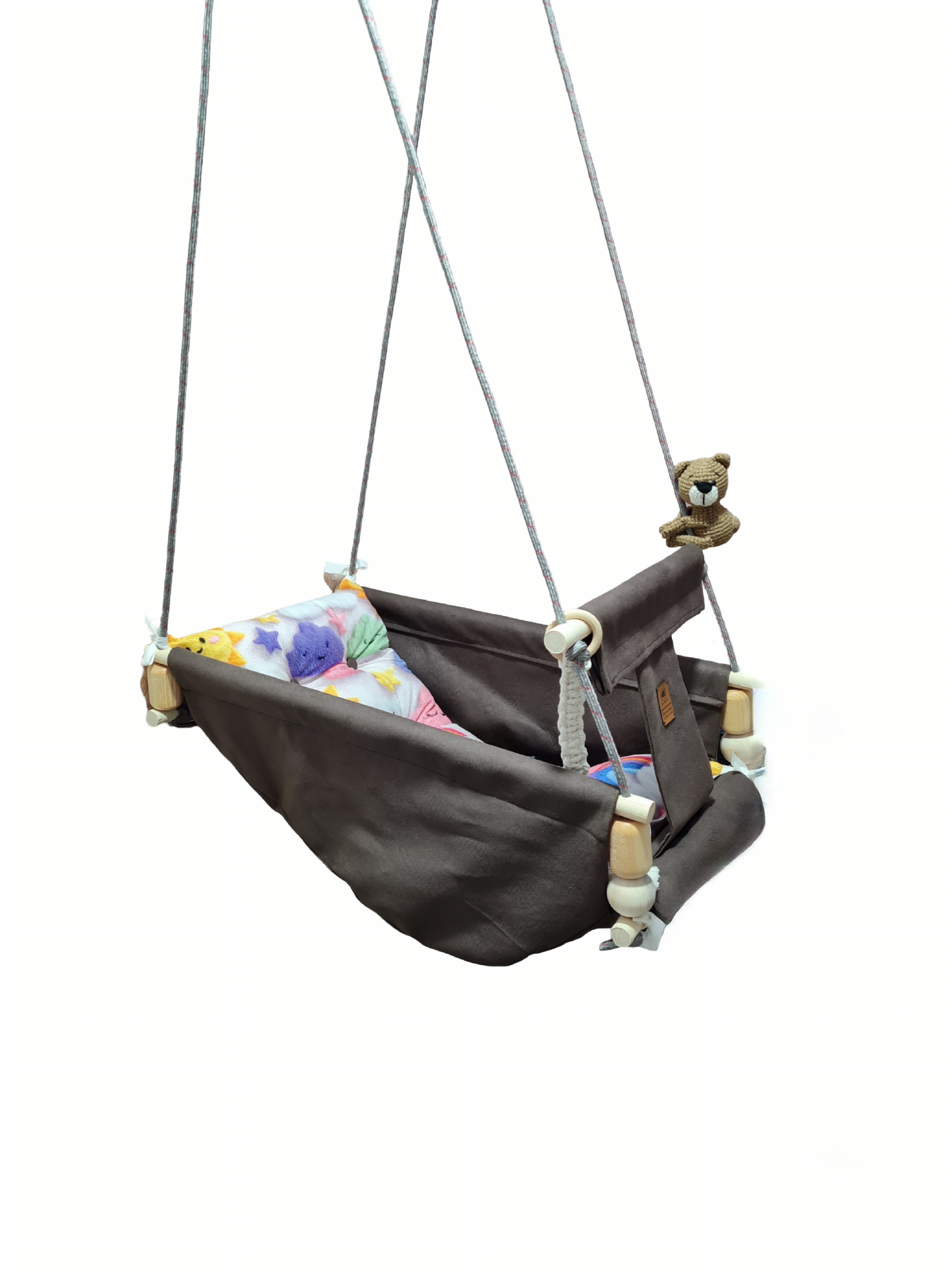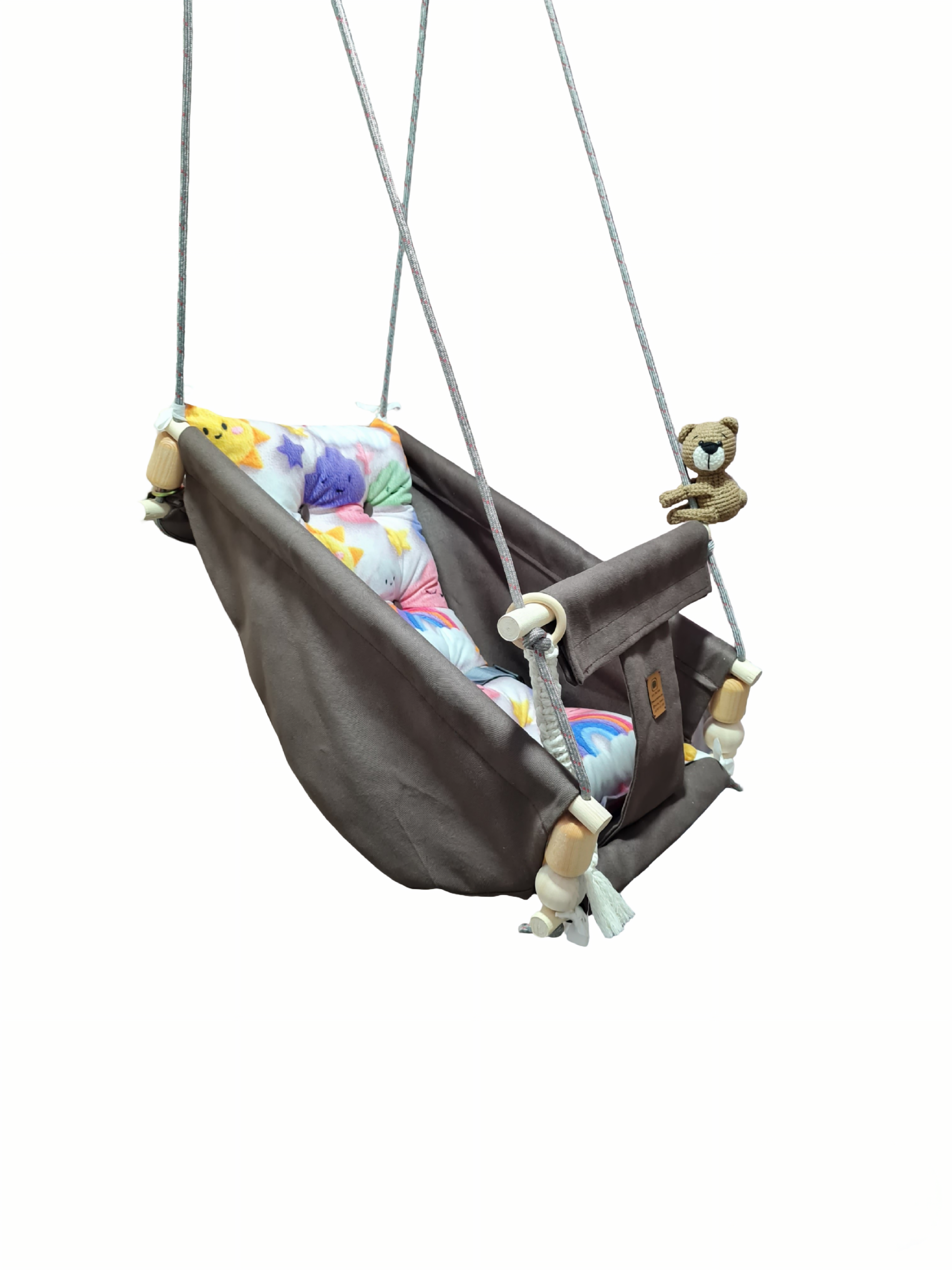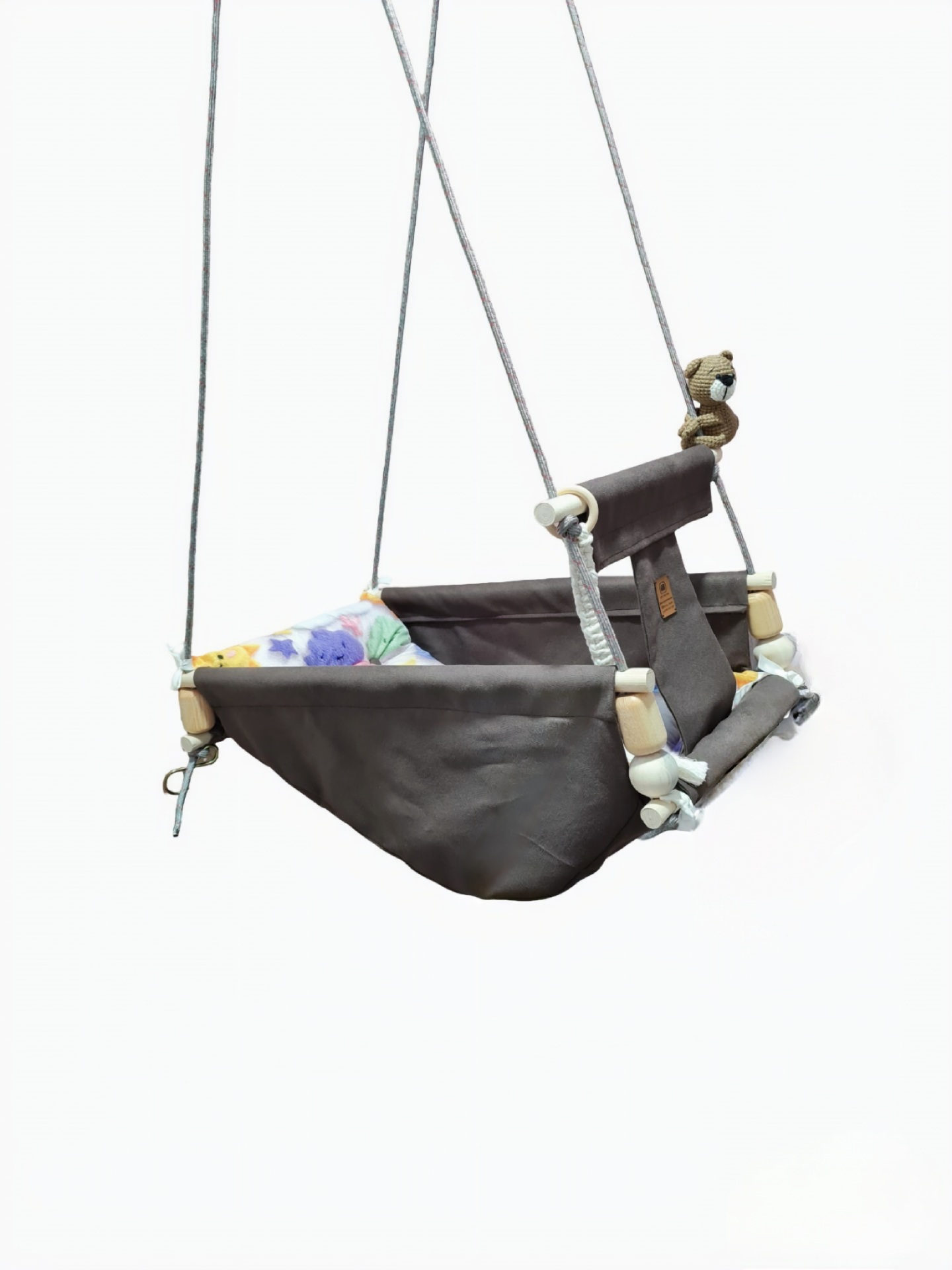 تاب کودک ام دی سری ننوئی مدل ابرا، وسیله ای سرگرم کننده و جذاب برای کودکان در محیط خانه و فضای باز است. یکی از بهترین بازی ها برای بچه ها، تاب بازی در منزل است که باعث احساس آرامش و لذت کودکان میشود. (از این تاب میتوانید در فضای باز و طبیعت هم استفاده کنید.) این تاب قابل نصب به میله بارفیکس و یا بست های سقفی می باشد. پارچه ی استفاده شده در این محصول از نوع پارچههای با کیفیت مبلی ترک (تمام نخ – ضد آلرژی) برای بدنه اصلی و پارچه مخمل پورشه برای تشکچه ها می باشد؛ همچنین از چوب طبیعی روسی باکیفیت بدون لبه های تیز استفاده شده است. فضای نشیمن کودک داخل تاب حدود 40 سانت در 60 سانت است وزن قابل تحمل تاب ام دی 45 کیلوگرم می باشد و مناسب همه کودکان از بدو تولد می باشد که با تنظیم طناب های پشتی به سه حالت خوابیده، لمیده و نشسته در می آید. همچنین قسمت تشکچه با چهار عدد بند در چهار جهت به بنده اصلی متصل می گردد. در بستهی این محصول به جهت سرگرم شدن کودک آویز مکرومه ای قرار داده شده است. این تاب به صورت مونتاژ شده و در کاور مخصوص برای مشتریان عزیز ارسال می گردد.